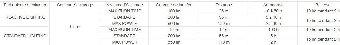 - More autonomy, visual comfort and reduced handling with the REACTIVE LIGHTING mode: the lighting power and the shape of the beam adapt automatically, thanks to a luminosity sensor that optimizes battery use,